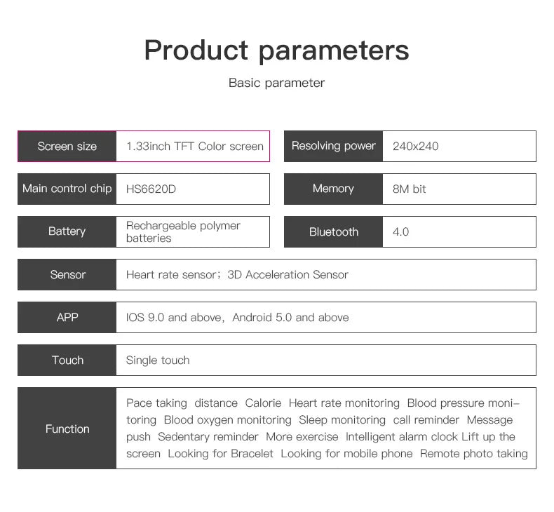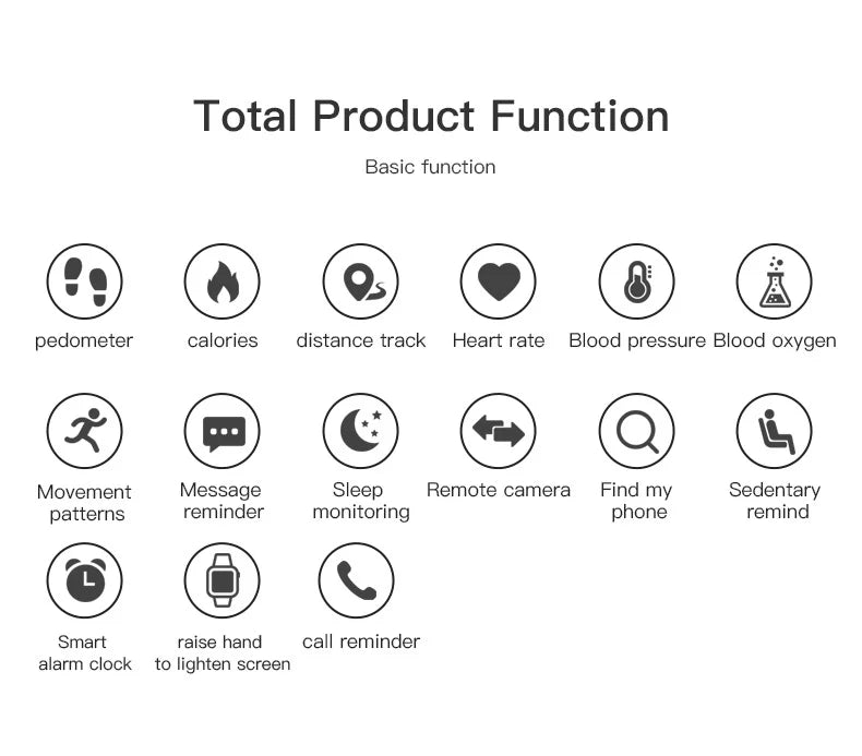 1. Smart Life Assistant: The watch can monitor steps, calories, heart rate, distance, sleep quality, and more. At the same time, it can connect to a smartphone to view information, take remote photos, search for phones, remind people of sedentary behavior, alarm clock, Bluetooth support, Android, iOS, etc, And other thoughtful and practical features, allowing you to understand exercise intensity and fitness status, so that you can adjust your fitness plan in a timely manner.